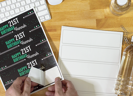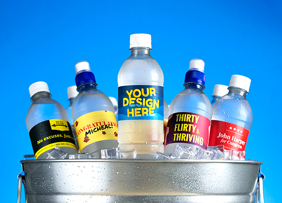 Get your water bottle labels blank or printed. Upload a design or use our easy design templates for that special occasion, business logo theme, or to use for brand awareness. We have a water bottle label for every volume need, from sheets to rolls.